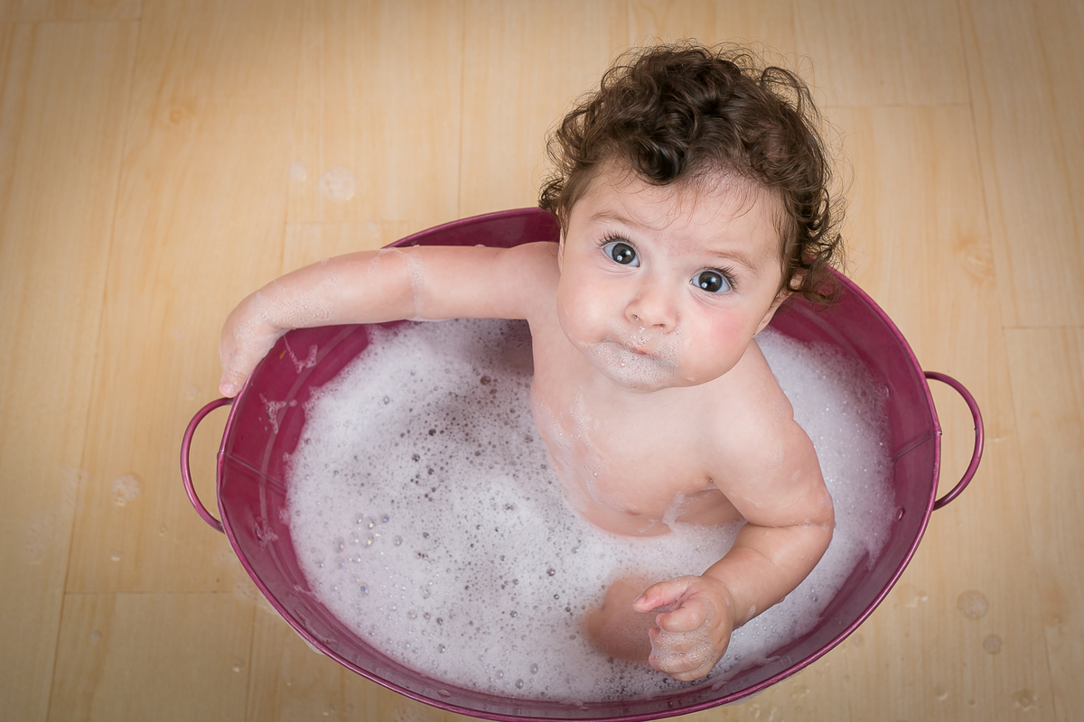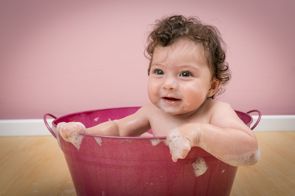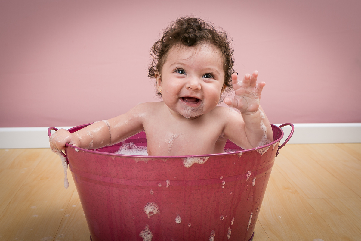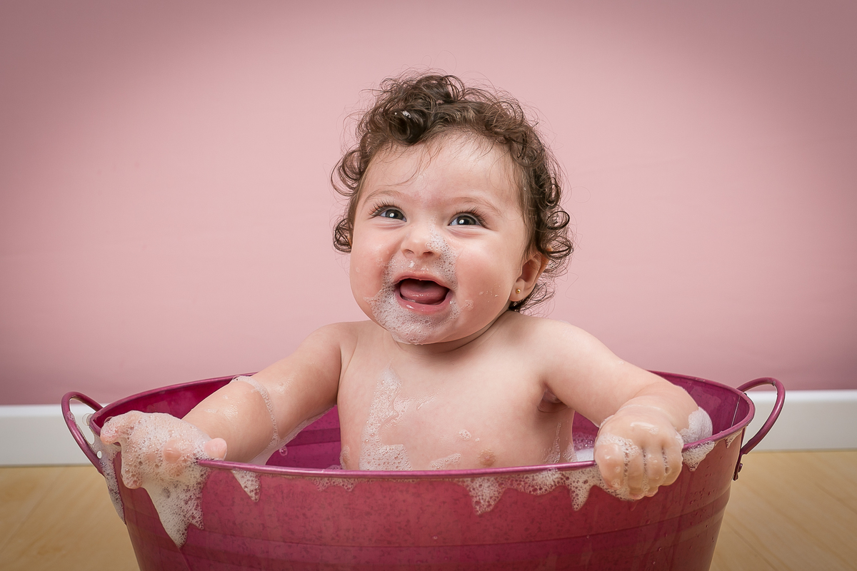 Linda, risonha e cheia de dobrinhas, ela amou meus tapetes fofinhos e o banho de bacia regado a muita espuma!